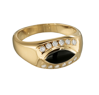 A marquise cut black onyx stone, framed by diamonds, and set in a sleek gold ring is the perfect way to award your employee