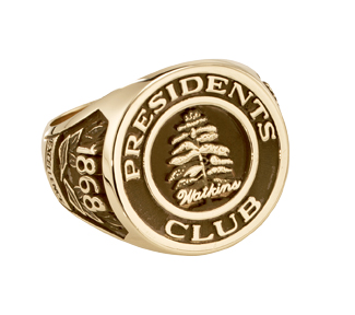 This men's two-tone gold signet ring features a polished gold logo in the center. Custom engraving, detailing, and the foundation year embellish the sides.