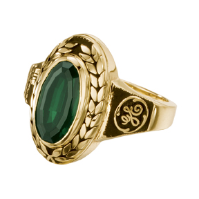 An oval cut emerald center stone is surrounded by a laurel wreath in this vintage-inspired women's gold ring. The General Electric logo shines in gold on the band.