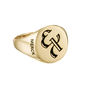 A cursive letter design is engraved into the top of this elegant gold signet women's ring for Merck. The engravings are filled with black color to make them pop against the gold.