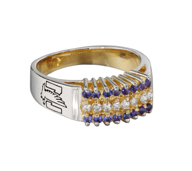 This dazzling sterling silver and gold ring features a celebratory arrangement of 24 stones. Sapphires and diamonds display the company colors, contrasting well with the gold from the interior of the ring. Custom engraving with black color fill adds an extra pop to the logo.